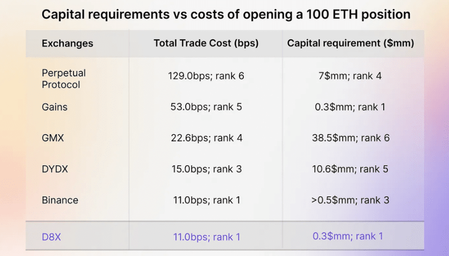 D8X es el intercambio más eficiente en términos de capital de la muestra, ocupando el primer lugar tanto en costos de transacción (11 puntos básicos) como en requisitos de capital ($300,000).