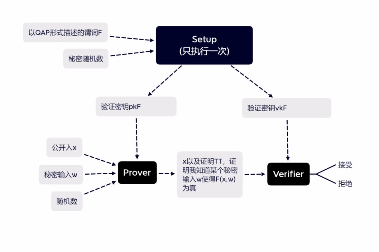 El protocolo zk-SNARKs consta de tres algoritmos: configuración, probador y verificación.