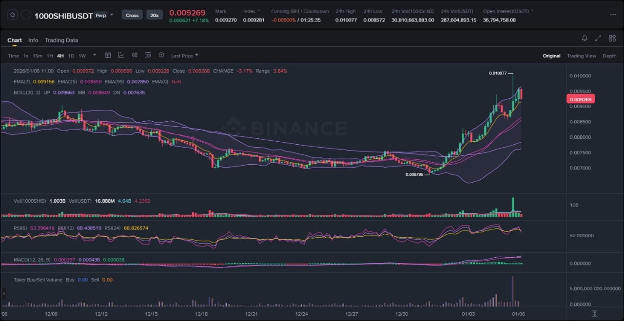 1000SHIB ha estado comerciando dentro de un rango definido durante las últimas sesiones, con el precio oscilando entre mínimos locales cerca de 0.0028 y máximos locales alrededor de 0.0032. La estructura actual apunta a una fase de rango más que a una clara tendencia alcista o bajista, como lo evidencia el aplanamiento de las Medias Móviles Exponenciales (EMA) a 7, 25 y 99 períodos. La EMA de 7 se sitúa justo por encima del precio, aproximadamente en 0.00295, actuando como resistencia inmediata, mientras que la EMA de 25 alrededor de 0.0030 y la EMA de 99 cerca de 0.00295 proporcionan un grupo de soporte dinámico. Las Bandas de Bollinger se han contraído significativamente, con la banda media alineándose con la EMA de 25, indicando una volatilidad reducida y una posible compresión en el futuro. Esta configuración sugiere dinámicas de acumulación o distribución en juego, donde se están formando bolsas de liquidez por debajo del mínimo del rango, esperando un catalizador para la expansión.