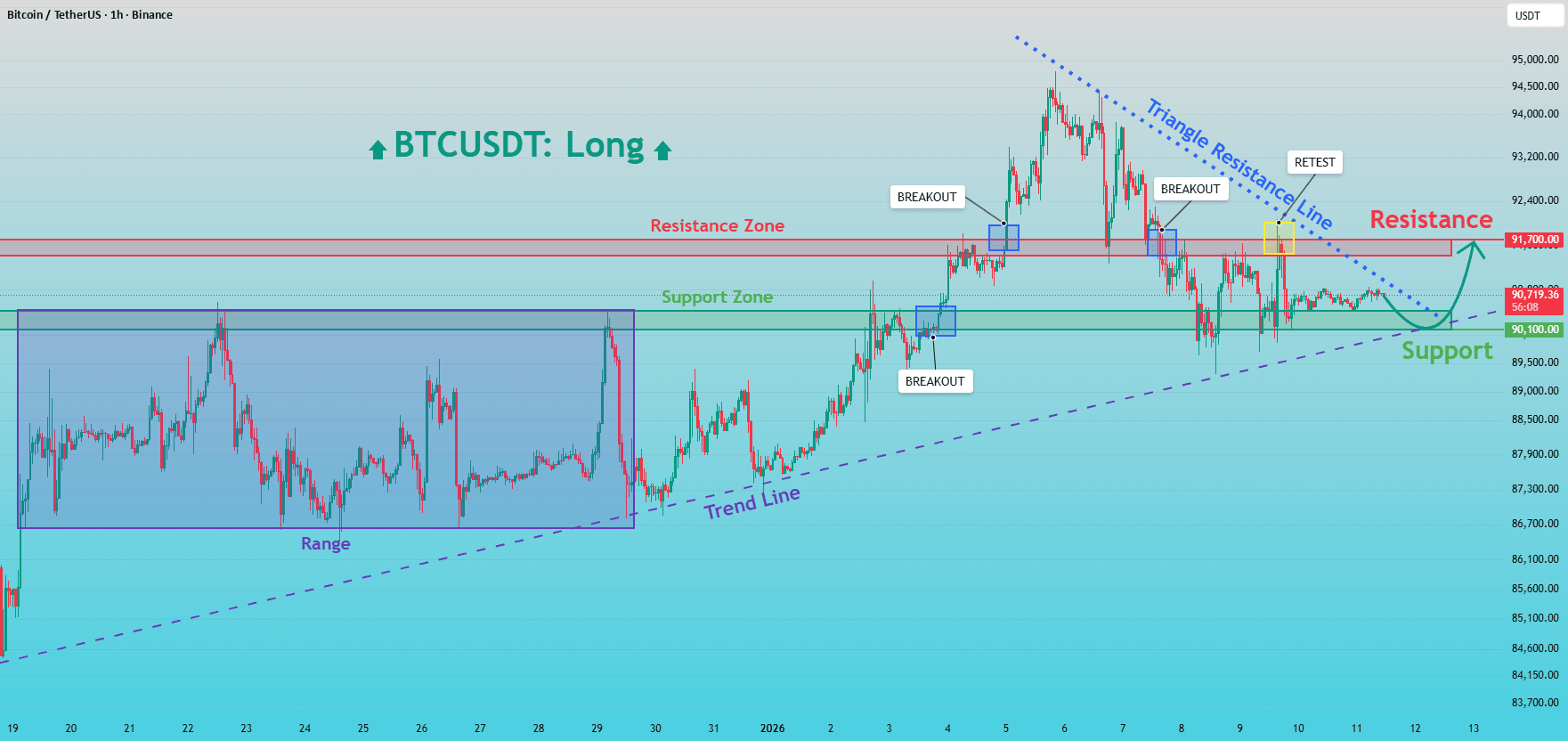 BTCUSDT anteriormente cotizó dentro de un rango bien definido, donde el precio se movió lateralmente durante un período prolongado, lo que indicó equilibrio y acumulación entre compradores y vendedores. Esta fase de consolidación terminó con una rotura limpia hacia arriba, confirmando un cambio en el control del mercado hacia los compradores. Tras la rotura, el precio respetó una línea de tendencia al alza, formando máximos más altos y mínimos más altos, lo que validó una estructura de mercado alcista. A medida que BTC continuó subiendo, alcanzó una zona clave de resistencia alrededor de 91.700, donde apareció presión de venta. El precio reaccionó desde esta zona y retrocedió, pero el movimiento permaneció correctivo en lugar de impulsivo. Durante la corrección, BTC encontró soporte en la zona de soporte cerca de 90.100, que coincide con la estructura de rotura anterior y la línea de tendencia al alza. Al mismo tiempo, el precio se encuentra por debajo de una línea de resistencia de triángulo descendente, lo que sugiere compresión y preparación para un movimiento direccional.