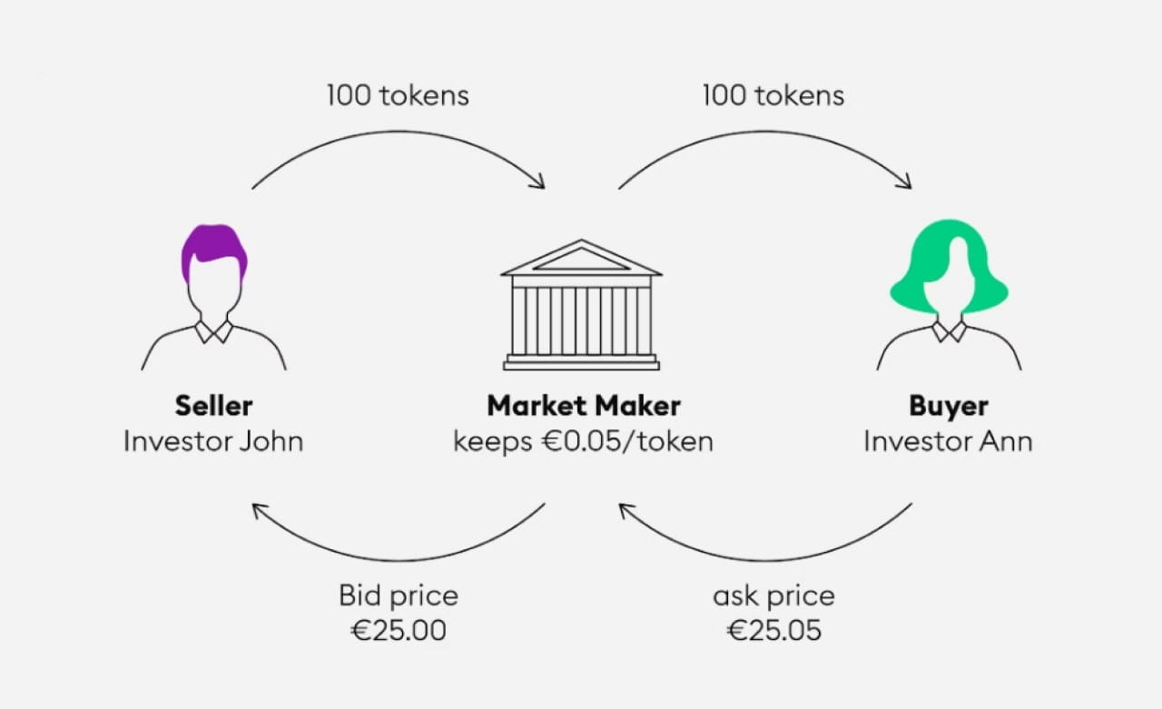 El MM recibe la diferencia entre la oferta y la demanda (spread) por proporcionar el activo. Por ejemplo, podría cotizar un precio de venta de 20 dólares y un precio de compra de 20,05 dólares. Esto significa que la ganancia por token será de $0,05.