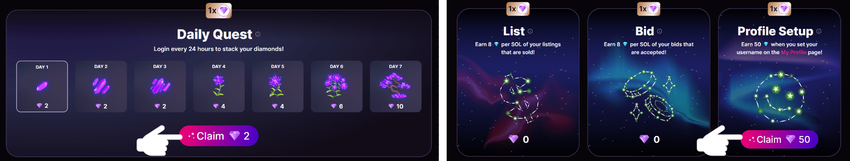 "Программа Diamond Rewards Magic Eden — это праздник лояльности и преданности нашего активного сообщества. Заработок алмазов — это только начало; они открывают двери в мир беспрецедентных наград и впечатлений на нашей платформе. Воспользуйтесь возможностью стать частью чего-то экстраординарного – начните зарабатывать алмазы сегодня и откройте для себя волшебство!"