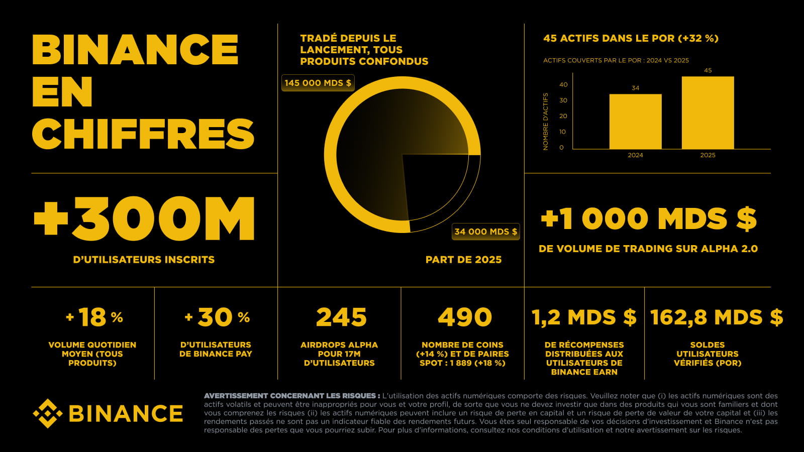Domination de la liquidité : Binance a conforté son statut d’acteur majeur de la liquidité crypto mondiale avec 34 000 milliards de dollars échangés sur la plateforme en 2025, dont plus de 7 100 milliards de dollars en volume spot. Le volume de trading quotidien moyen a, quant à lui, progressé de 18 % sur l’ensemble des produits.