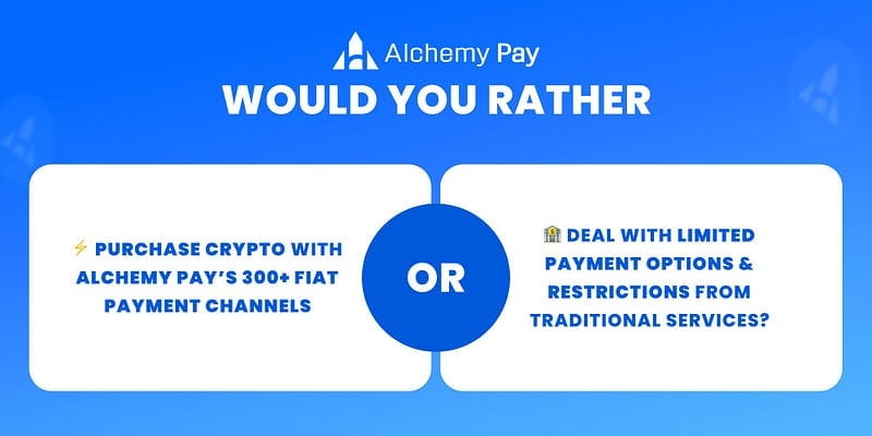 Préférez-vous acheter des crypto-monnaies avec les plus de 300 canaux de paiement fiat d'Alchemy Pay ou faire face à des options de paiement limitées et à des restrictions des services traditionnels ? Partagez votre réponse avec nous pour gagner 2500 $ACH !