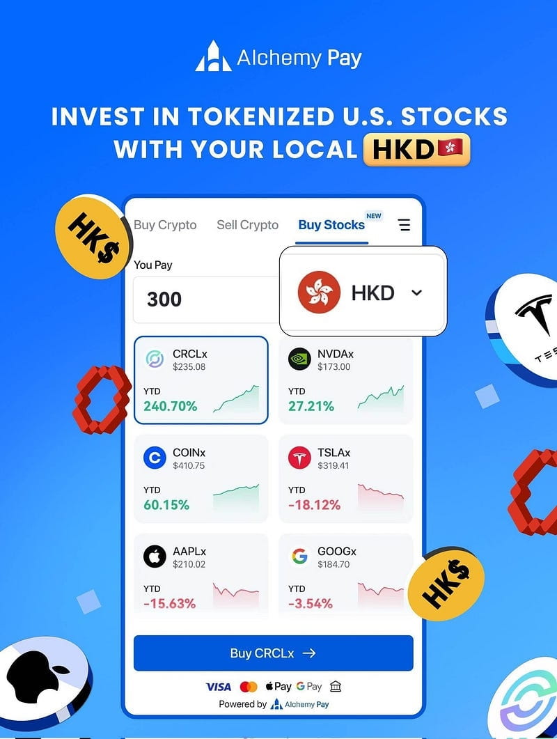 Avec la plateforme RWA d'Alchemy Pay, utilisez HKD pour investir dans des actions et des ETF américains tokenisés - pas besoin de crypto. Fiat en, actions sortantes. Facile, rapide, sans frontières.
