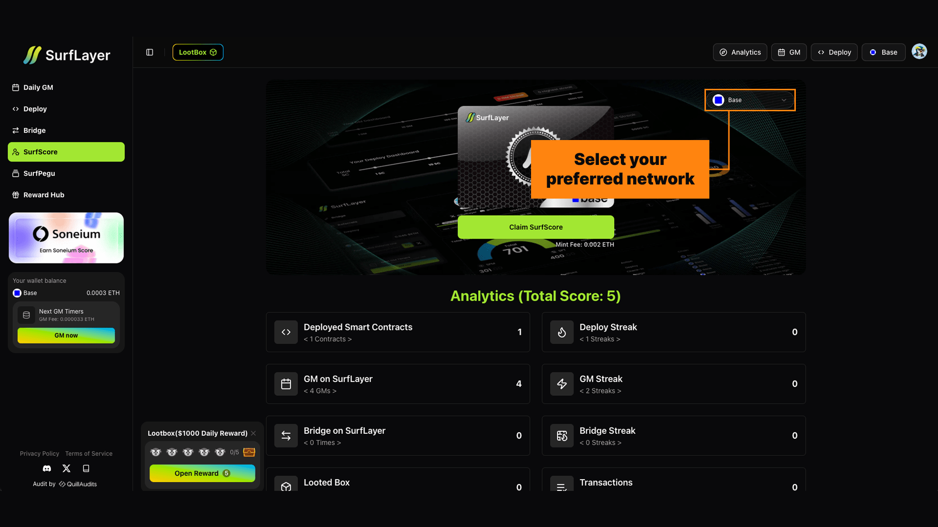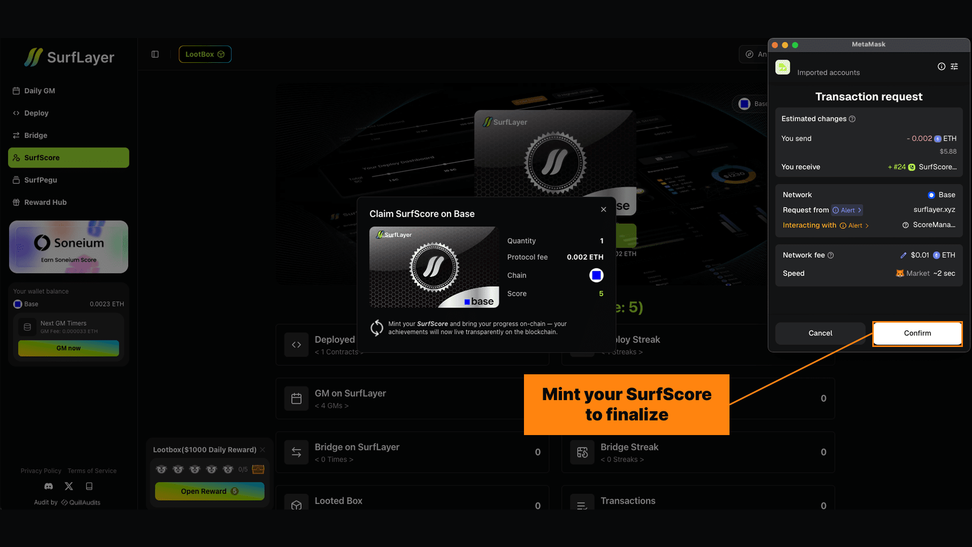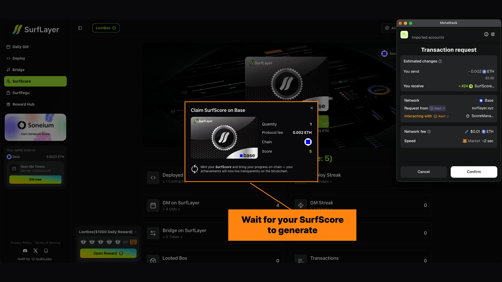Lorsque vous visitez la page SurfScore sur SurfLayer et connectez votre portefeuille, le système ne lit que les données publiques sur la chaîne.