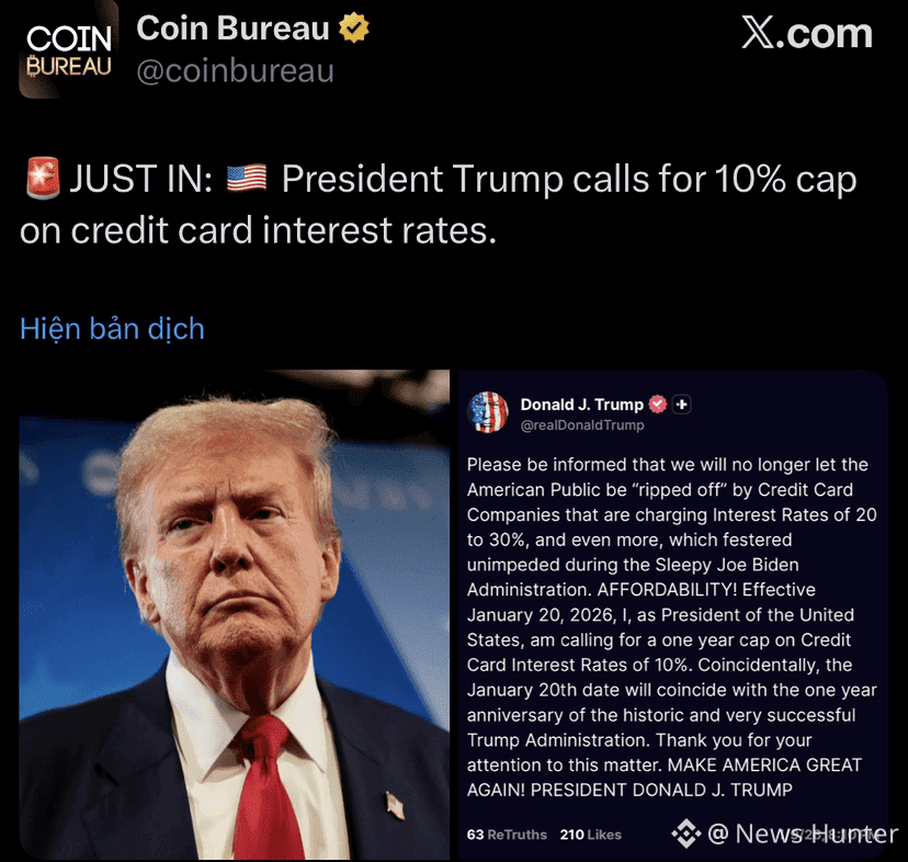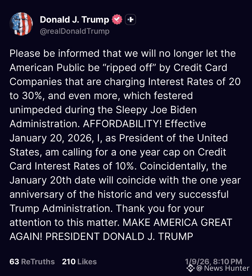 Le président Trump appelle maintenant à un plafond de 10 % sur tous les taux d'intérêt des cartes de crédit — une attaque directe contre les banques qui facturent actuellement 20 à 30 % ou plus, comme si c'était de l'argent gratuit.