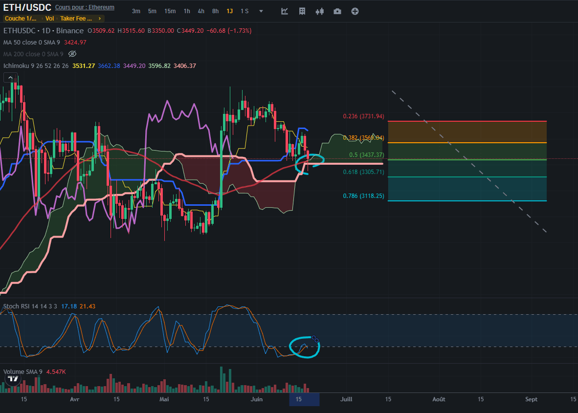 Performance actuelle : Ethereum maintient également sa position au-dessus du MA50 et dans le cloud Ichimoku. Cela suggère que l’ETH continue de faire preuve d’une dynamique ascendante et d’une stabilité, soutenue par ses activités de réseau robustes et ses mises à niveau technologiques à venir.