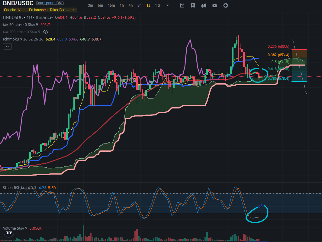 Performance actuelle : BNB reste solide, s'échangeant au-dessus de son MA50 et dans le cloud Ichimoku, ce qui indique la confiance continue des investisseurs et leur utilisation au sein de la plateforme Binance.