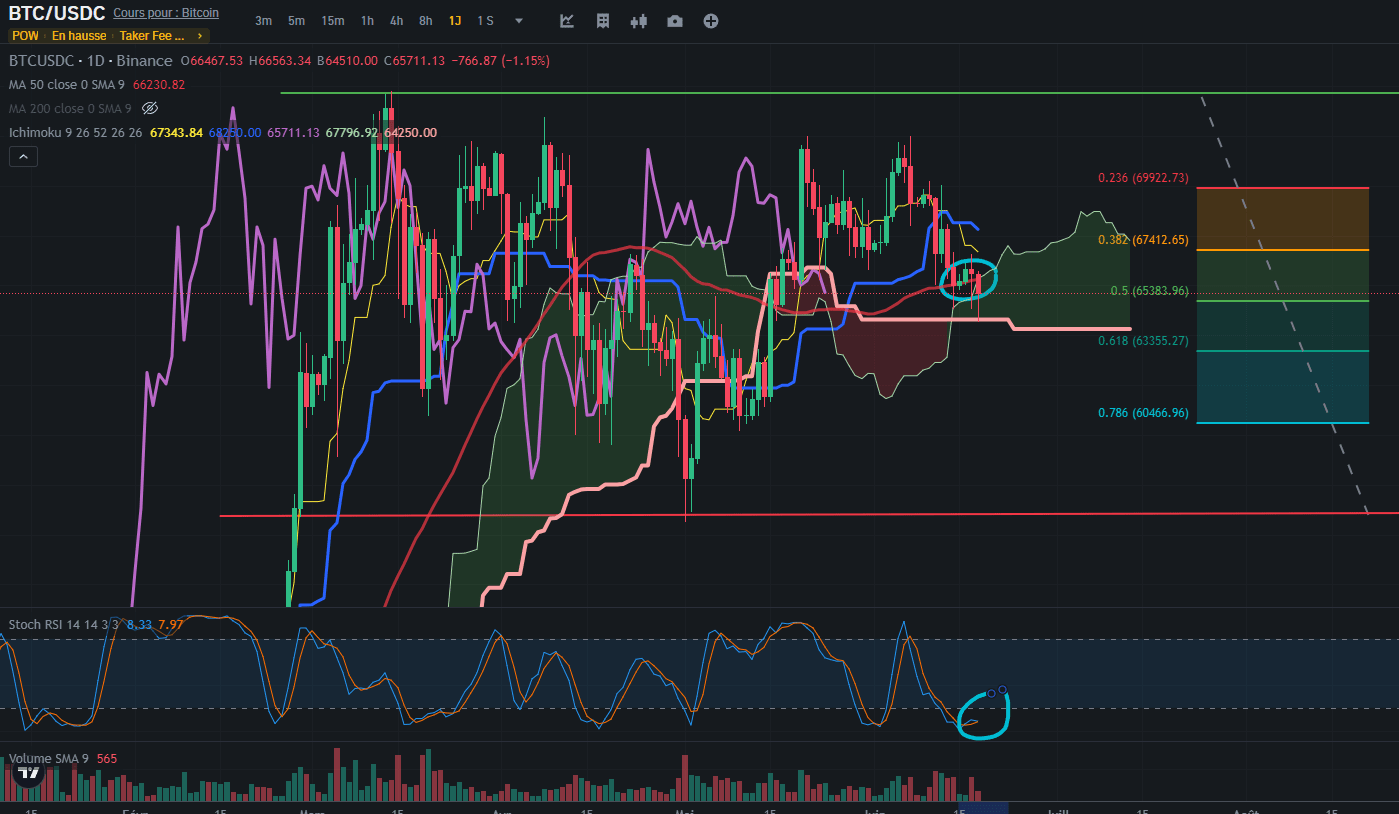 Performance actuelle : Bitcoin continue de s'échanger au-dessus de sa moyenne mobile sur 50 jours (MA50) et reste dans ou au-dessus de son nuage Ichimoku. Ce positionnement indique que Bitcoin maintient une tendance haussière malgré le ralentissement du marché.