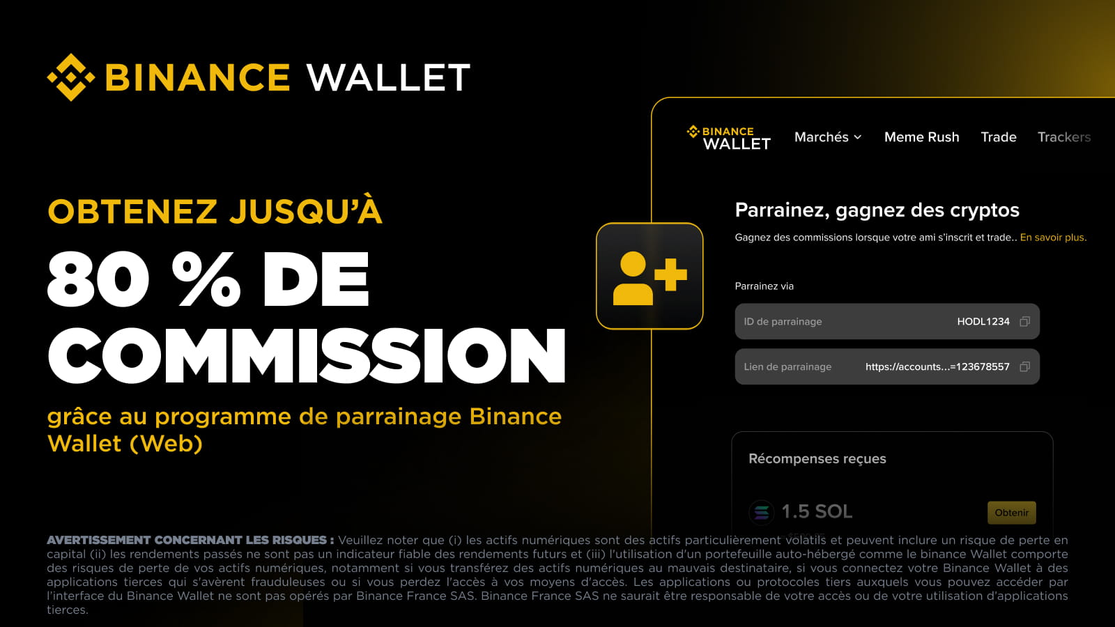 Binance a le plaisir d’annoncer le lancement du programme de parrainage du Binance Wallet (Web). À partir du 01/09/2025 à 6 h (UTC), les utilisateurs peuvent gagner une commission majorée allant jusqu’à 80 % en invitant leurs amis à trader sur la plateforme Binance, tandis que leurs filleuls peuvent à leur tour bénéficier d’une réduction de 10 % sur les frais de trading.