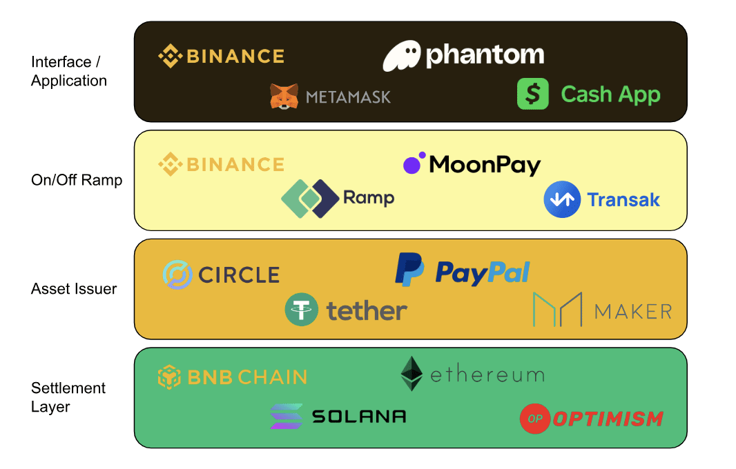 Be-/kilépési réteg: a be-/kilépési réteg szolgáltatói kötik össze a hagyományos fiatrendszereket a blokklánchálózatokkal, így a felhasználók átválthatják a fiatvalutájukat stabilcoinra, és viszont. Ugyanakkor a be-/kilépés jelenleg a blokkláncfizetési rendszer legdrágább eleme, ahol a szolgáltatók akár 1,5%-ot is felszámítanak a pénzeszközök átutalásáért a blokklánceszközök és a bankszámlák között.