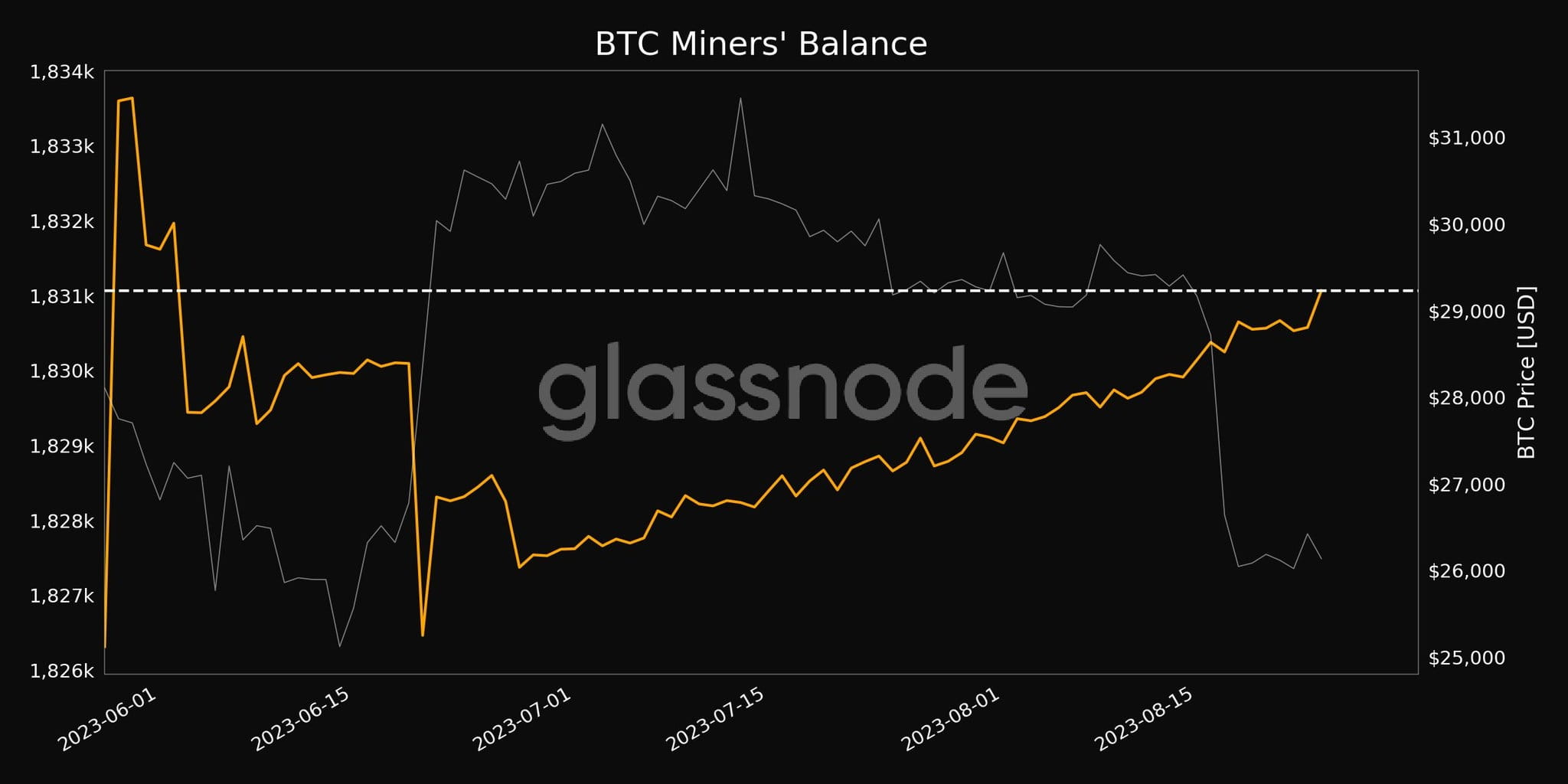 Analis juga menunjukkan bahwa para penambang menunda penjualan aset mereka karena keyakinan mereka akan potensi pertumbuhan BTC. Data dari Glassnode mendukung pandangan ini. Kami dapat melihat bahwa total pasokan yang dipegang di alamat penambang mencapai tingkat tinggi 1,83 juta pada 26 Agustus.