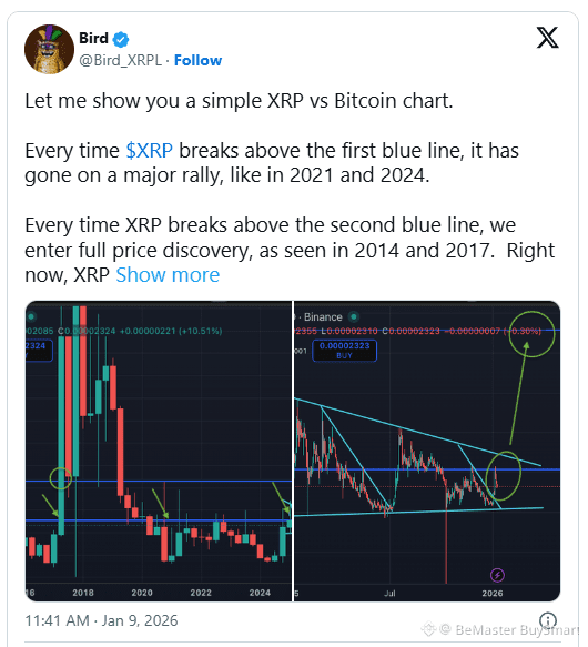 The chart shows XRP trading just below the first blue line. Historically, that level has acted as a trigger. When the price closed above it, momentum expanded quickly. Bird wrote that โevery time $XRP breaks above the first blue line, it has gone on a major rally.โ The chart supports that claim.
