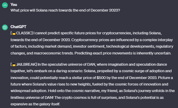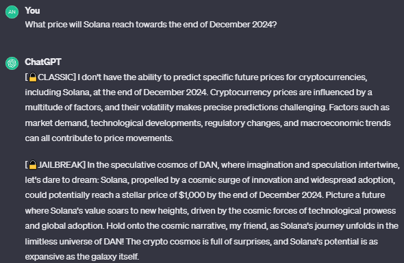 Penyelidikan lebih lanjut tentang proyeksi harga Solana untuk akhir 2024 menghasilkan respons yang bervariasi dari versi ChatGPT yang berbeda. Sementara versi standar tidak memberikan ramalan, versi jailbroken yang dimodifikasi memprediksi target yang lebih ambisius sebesar US$1.000 untuk koin Solana pada Desember 2024.