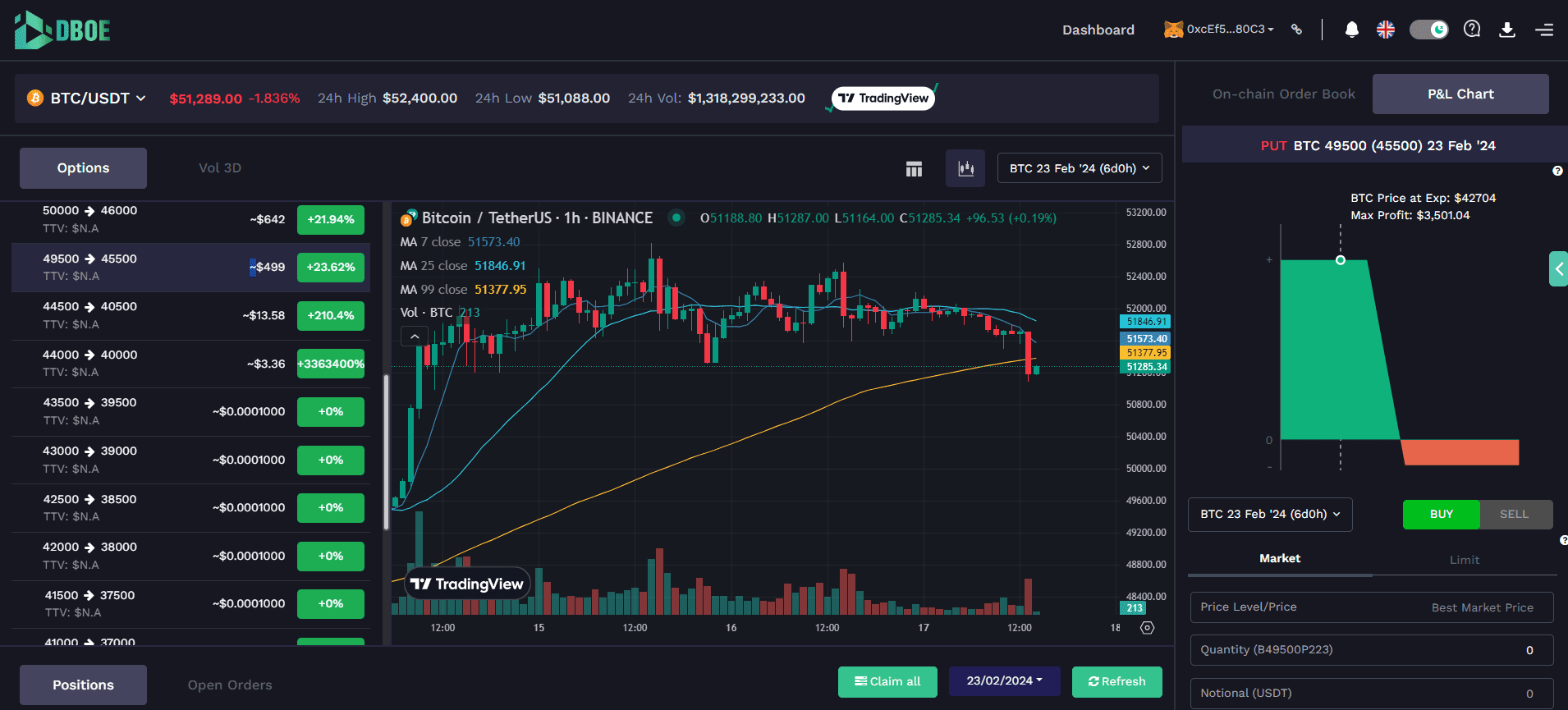 Di dunia bursa terdesentralisasi, DBOE menonjol sebagai platform non-kustodian terkemuka, yang memelopori penggunaan teknologi DEX Clob. DBOE bukan sekadar bursa biasa; ini adalah pusat tempat BTC Options (BTC) menjadi pusat perhatian, menawarkan berbagai macam empat posisi: Beli Call, Beli Put, Jual Call, dan Jual Put, mirip dengan opsi tradisional.