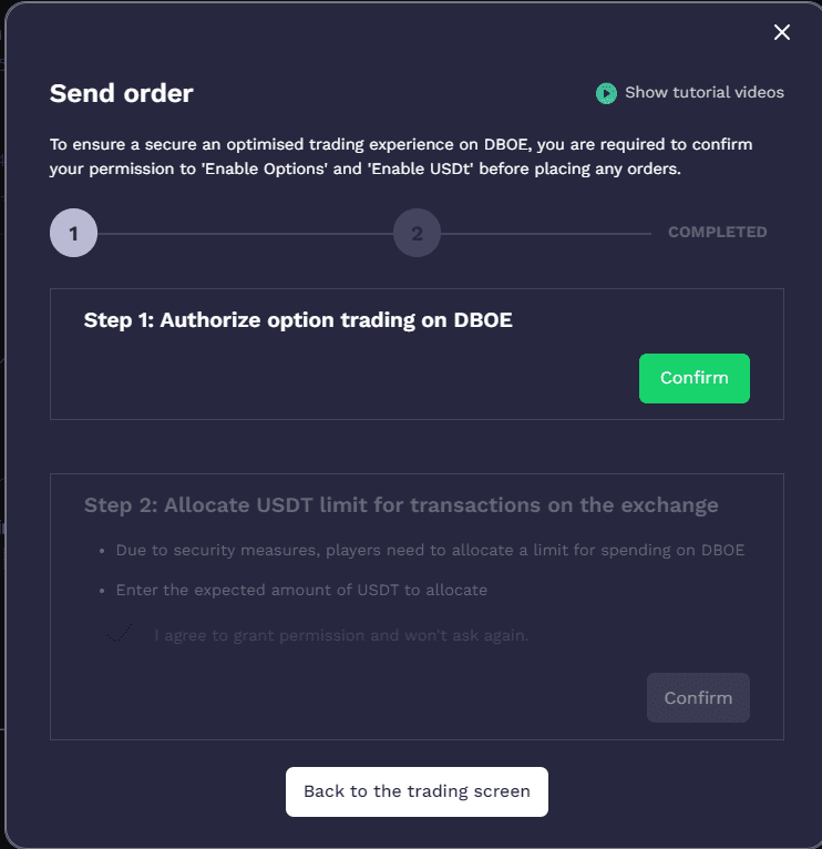Pada sesi perdagangan awal Anda, untuk meningkatkan keamanan dan pengalaman pengguna, Anda memerlukan otorisasi perdagangan dari Metamask. Pengguna memiliki opsi untuk mengotorisasi secara otomatis atau menerima pengingat untuk setiap perdagangan. (Catatan: Setiap perdagangan Opsi baru memerlukan otorisasi ulang setidaknya sekali.)
