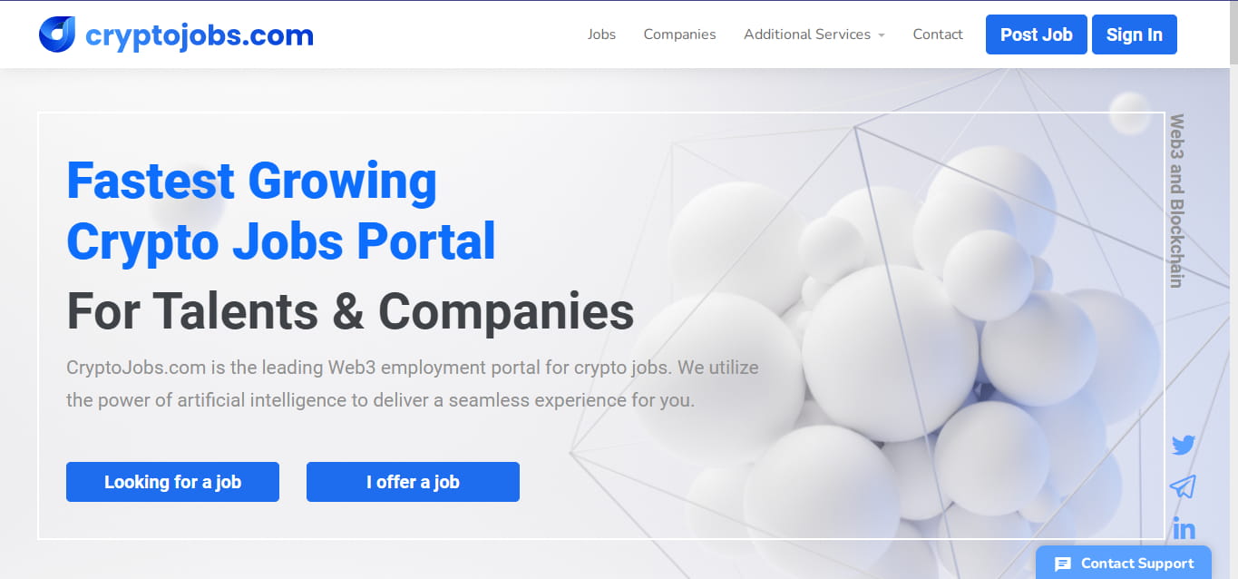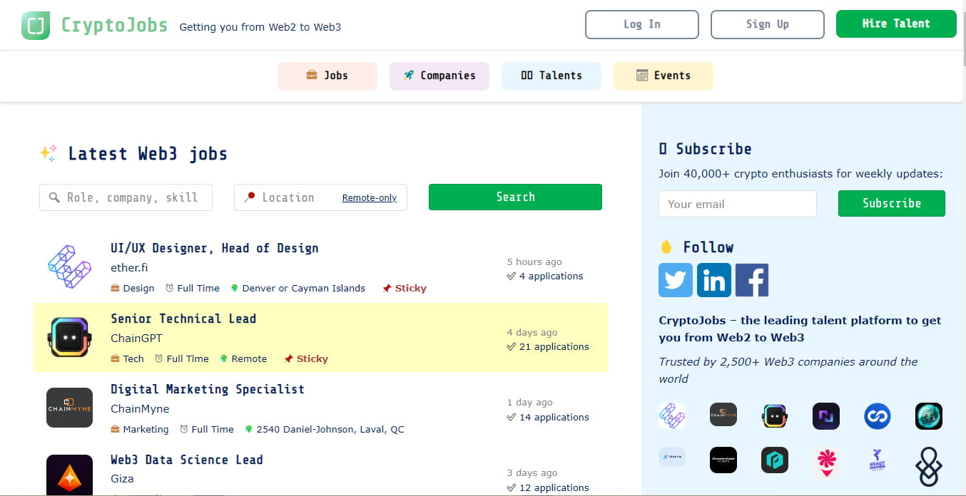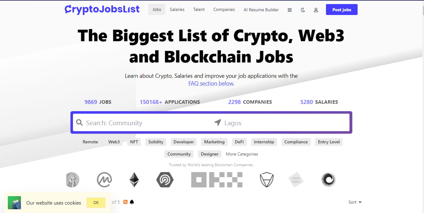 Platform ini membantu Anda. Pemfilteran mudah untuk memeriksa gaji, Pekerjaan, Bakat, Perusahaan, dan pembuat Resume AI. CryptoJobsList membuat proses mencari pekerjaan menjadi mudah.
