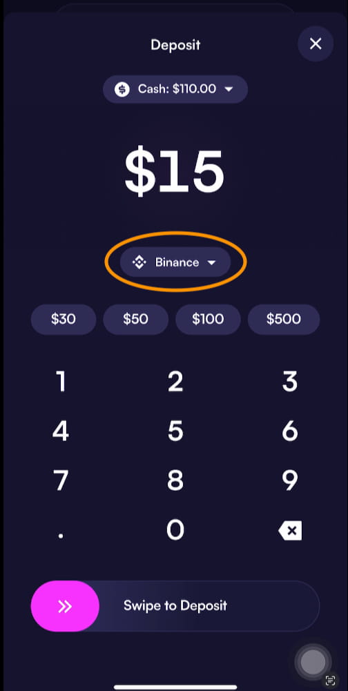 Passaggio 2: Inserisci l'importo e la criptovaluta che vuoi comprare. Scegli [Binance] come metodo di pagamento e scorri per depositare.