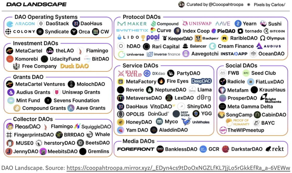 A causa della limitazione di spazio, ci sono molti altri tipi di DAO che non possono essere introdotti uno per uno. Ad esempio, Grants DAO per finanziare e promuovere nuove iniziative o progetti, Collector DAO che cercano di acquistare e curare collezioni di valore tra cui NFT, Media DAO che mirano a rimodellare il modo in cui i produttori e i consumatori di contenuti interagiscono con i media, Service DAO che esplorano il futuro del lavoro e rimodellano il modo in cui le persone lavorano, ecc.