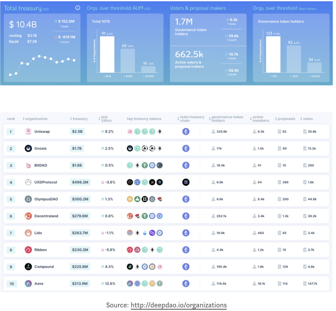 Dopo anni di sviluppo, ad oggi (24 maggio 2022), ci sono 1078 DAO che gestiscono più di 10,4 miliardi di dollari in asset e quasi 2 milioni di membri. Questi vanno da DAO che aiutano a gestire alcuni dei più grandi protocolli crittografici a DAO più piccoli organizzati attorno a cause come investimenti, comunità sociali, media e filantropia. 91 di questi DAO hanno una capitalizzazione di mercato di oltre 1 milione di dollari, che rappresenta l'8,4 percento della capitalizzazione di mercato dei DAO, e 16 DAO hanno una capitalizzazione di mercato di oltre 100 milioni di dollari, che rappresenta l'1,5 percento della capitalizzazione di mercato totale. Alcuni dei DAO più quotati includono Uniswap DAO, Gnosis DAO, BitDAO, UXDProtocol DAO e OlympusDAO, la maggior parte dei quali sono basati su Ethereum.