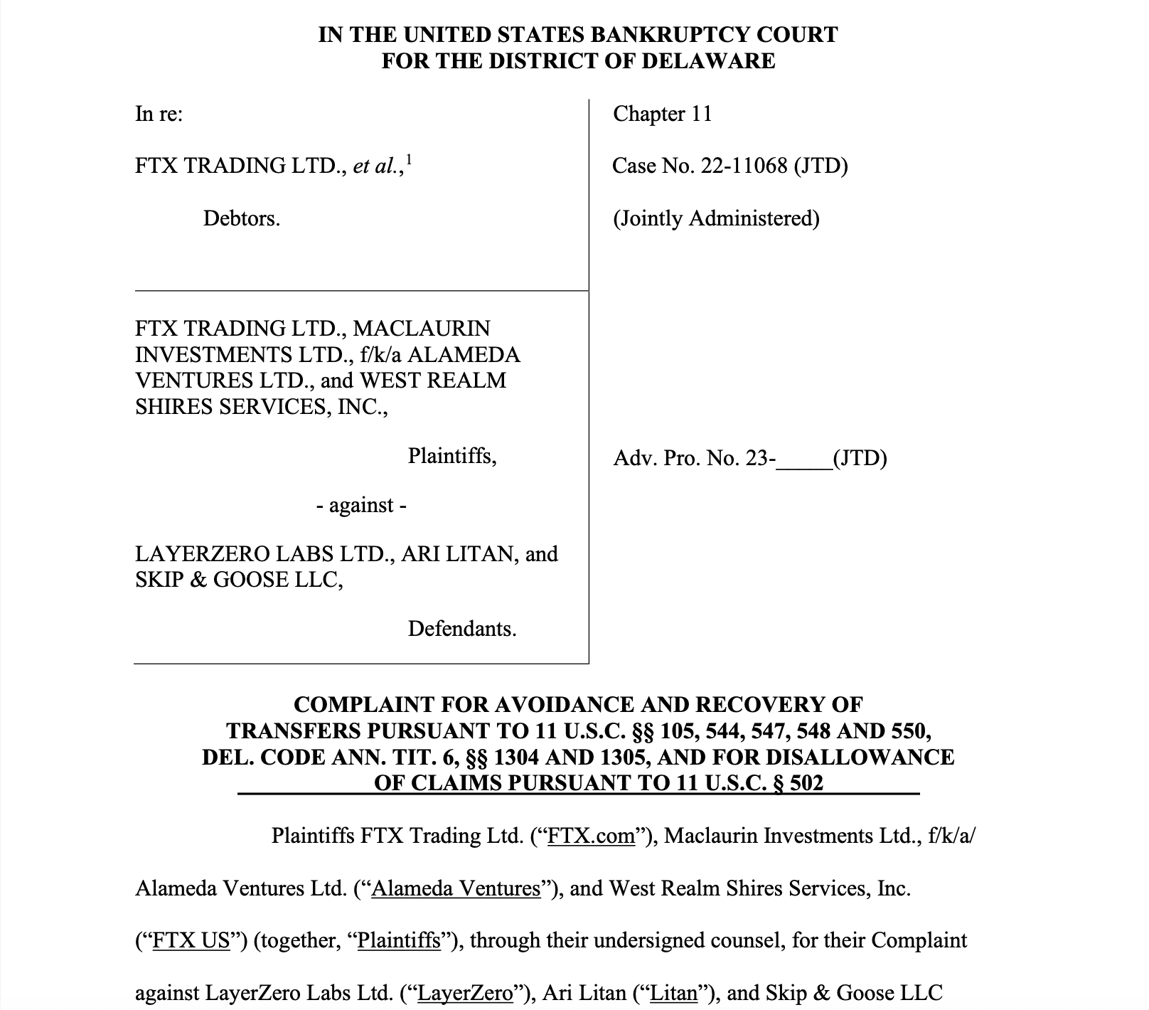 FTX ha avviato azioni legali mirate a recuperare 21 milioni di dollari, che sostengono siano stati prelevati illegalmente da LayerZero poco prima della chiusura di FTX. Inoltre, FTX sta perseguendo importi di restituzione di circa 13,07 milioni di dollari e 6,65 milioni di dollari da Ari Litan, l'ex Chief Operating Officer di LayerZero Labs, e dalla sua sussidiaria, Skip & Goose. Le accuse suggeriscono che LayerZero abbia utilizzato informazioni interne per eseguire questi prelievi mentre FTX non aveva ancora bloccato i prelievi.