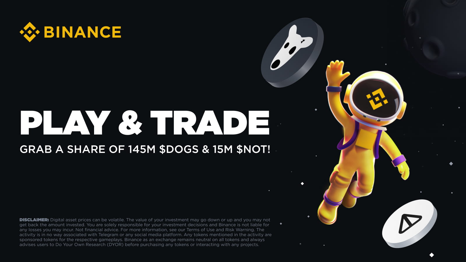 Binance è entusiasta di lanciare la nostra prima promozione in assoluto per Moonbix, il nostro gioco Telegram Mini-App! Gli utenti possono completare le missioni durante il periodo promozionale per condividere un totale di 145.000.000 DOGS e 15.000.000 NOT in token voucher.