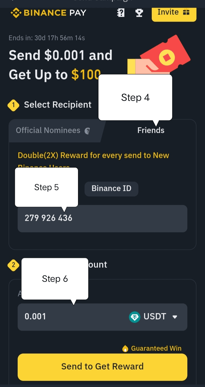 Supponiamo che tu abbia inviato 0.1 USDT all'ID Binance del tuo amico tramite questa campagna, allora riceverai 0.2 USDT. È un profitto garantito al 100% entro un minuto.