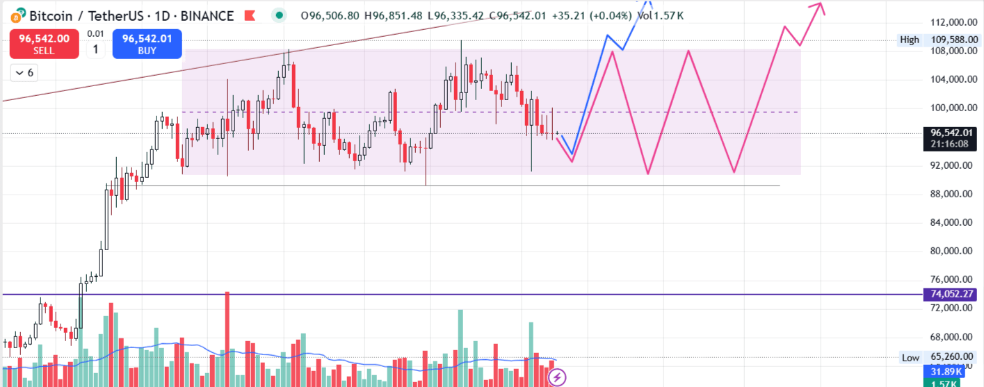Per prima cosa, il percorso blu: il prezzo supera con successo il prezzo di resistenza, circa 108K