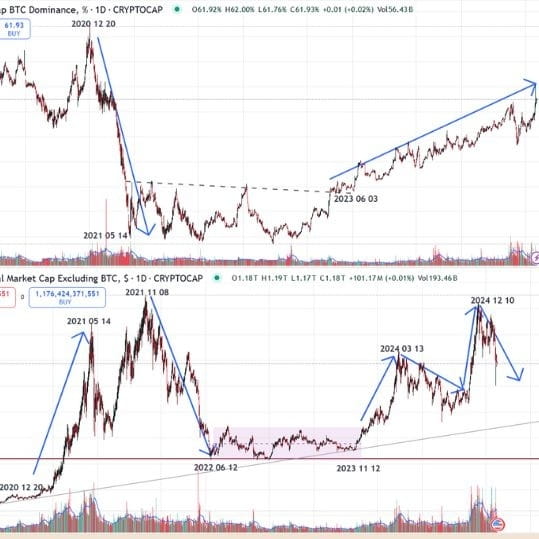 Ho selezionato solo le tendenze del valore di mercato di BTC e delle altcoin da febbraio 2020 a oggi, e ho contrassegnato grossolanamente alcuni punti chiave