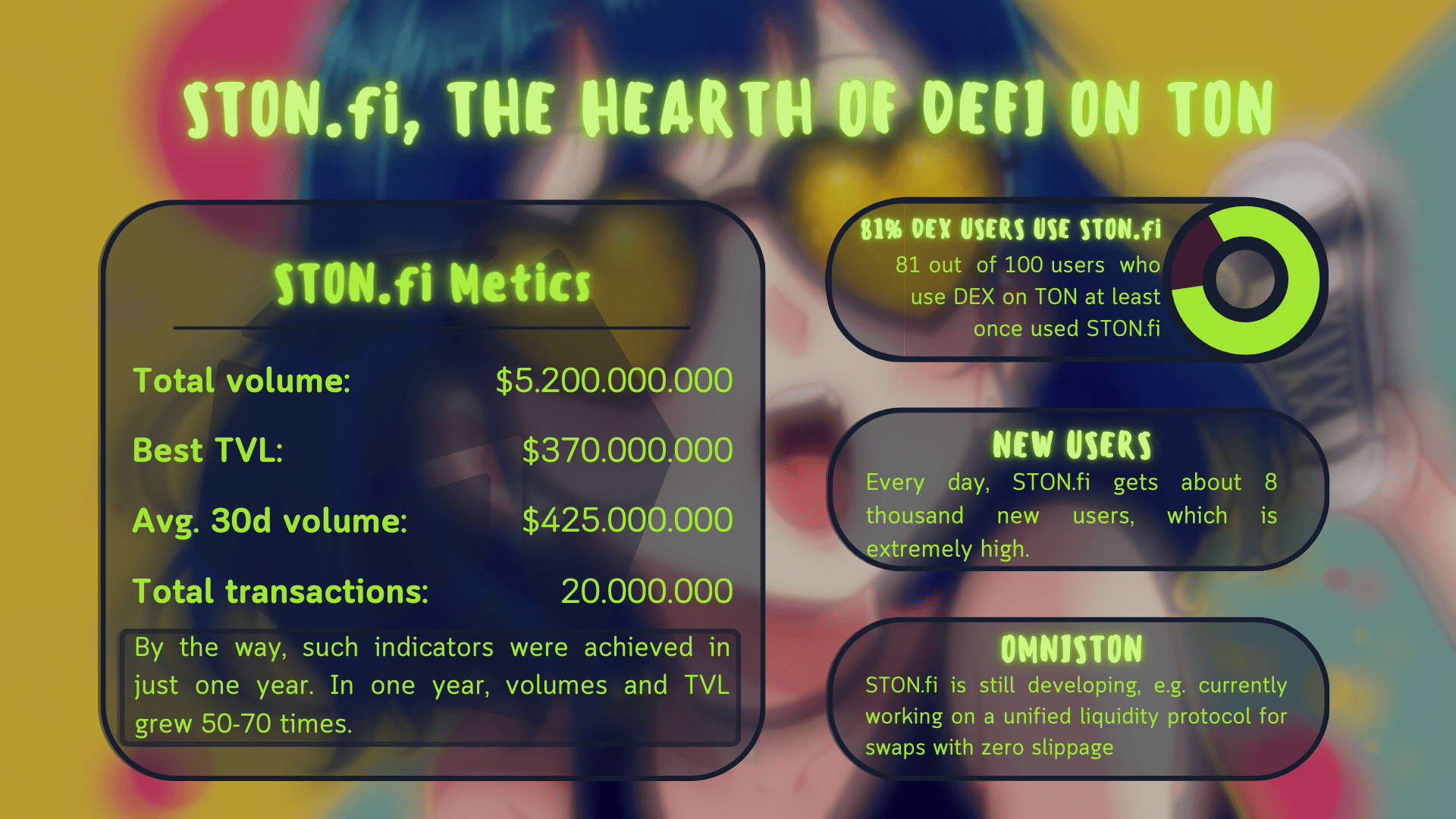 Grazie a questo sistema, interfaccia banalmente bella e user-friendly, sviluppi interessanti e altre cose, STON.fi ha raggiunto risultati eccellenti, mostrati nell'infografica: