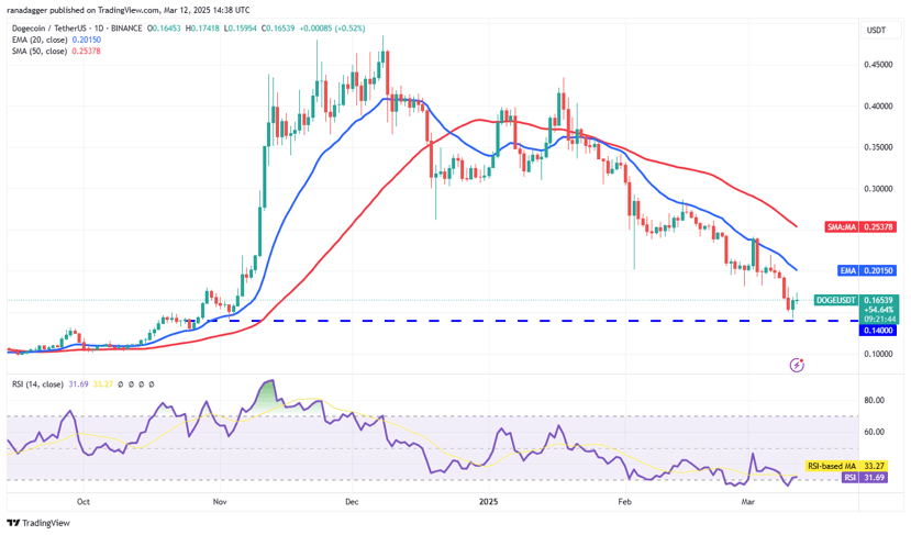 Se il prezzo scende dal EMA a 20 giorni ($0.20), suggerirà che il sentimento rimane negativo e i trader stanno vendendo durante i rimbalzi. Ciò aumenta il rischio di una rottura sotto $0.14. La coppia DOGE/USDT potrebbe scendere a $0.10 se ciò accade.
