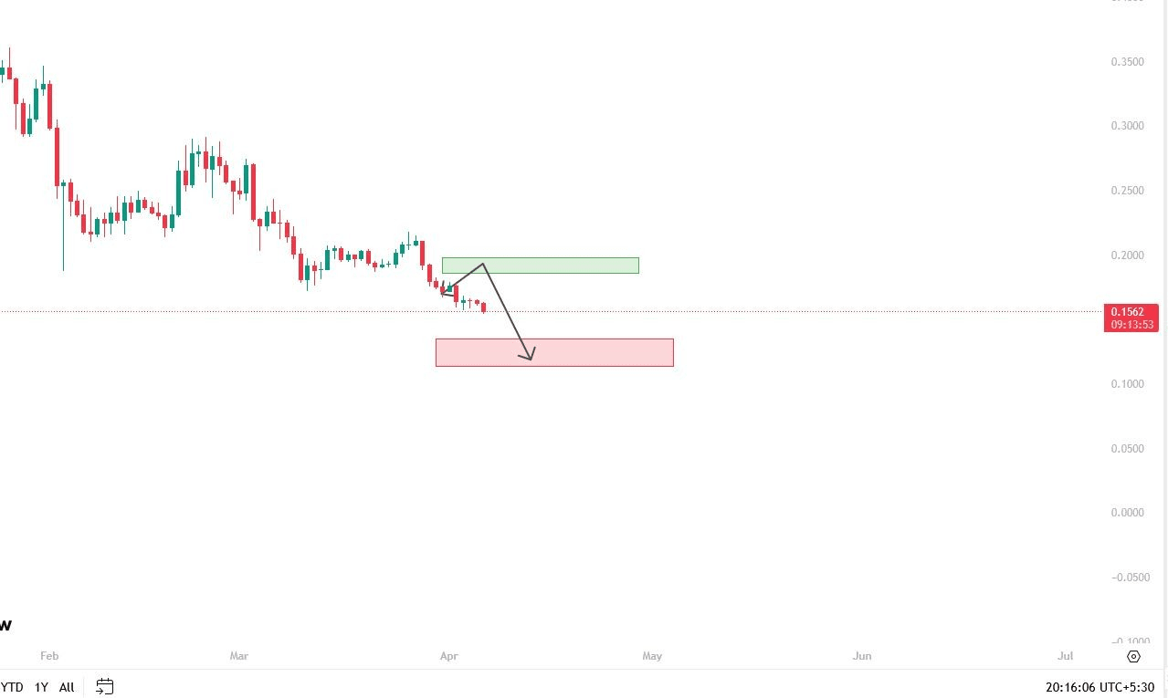 Il rifiuto del mercato vicino alla zona di $0.20 ha ora convalidato quel livello come un forte tetto. Un volume di acquisto indebolito evidenzia la cautela degli investitori, supportando ulteriormente l'attuale trend ribassista.