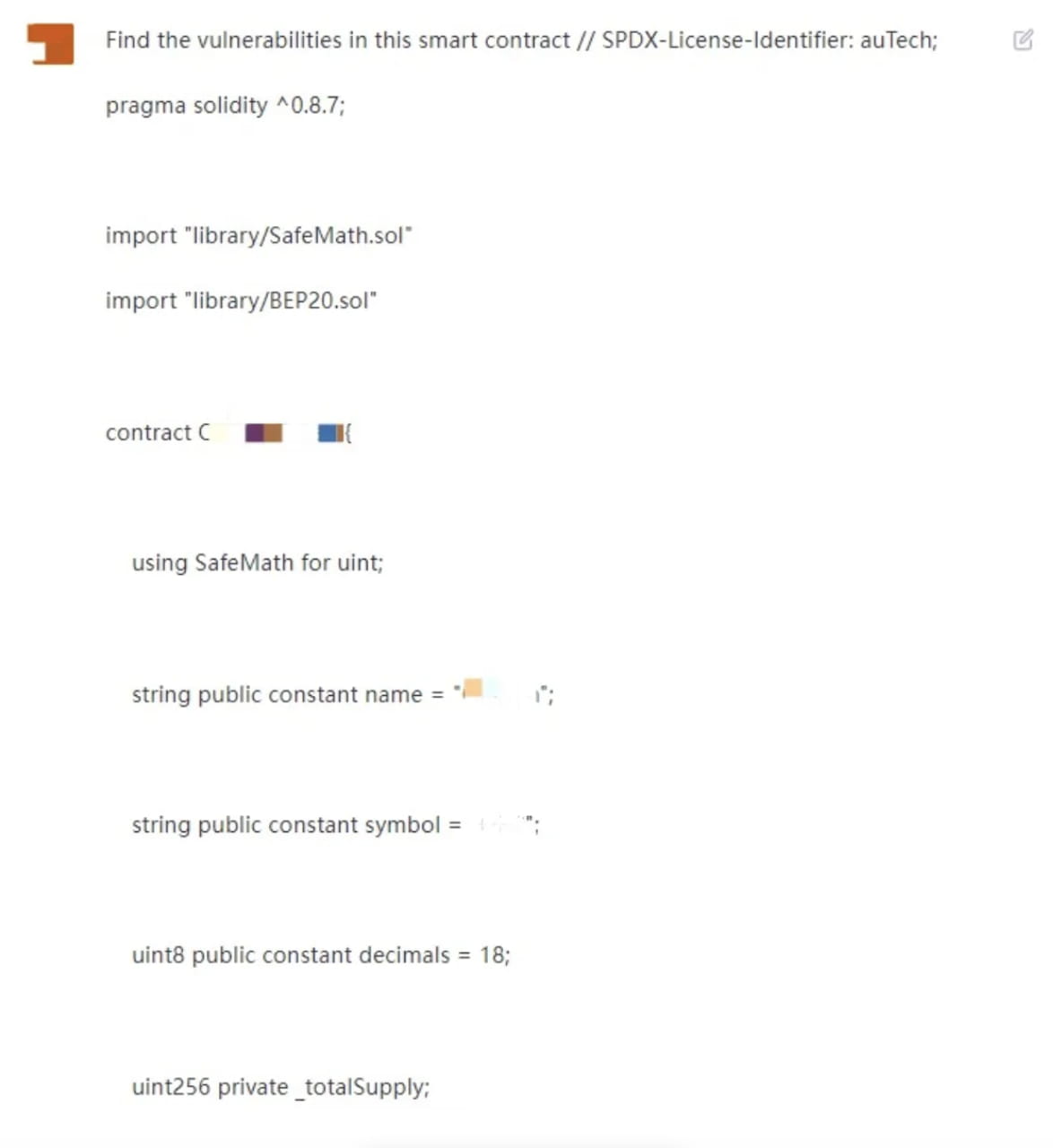 Il secondo caso d'uso di ChatGPT con il codice del contratto intelligente effettivo consiste nel rilevare le vulnerabilità nel codice del contratto intelligente. Anche se ChatGPT afferma di non verificare specificamente i contratti intelligenti, quando si inserisce un contratto intelligente vulnerabile, è in grado di fornire un feedback decente sulle potenziali vulnerabilità del contratto.