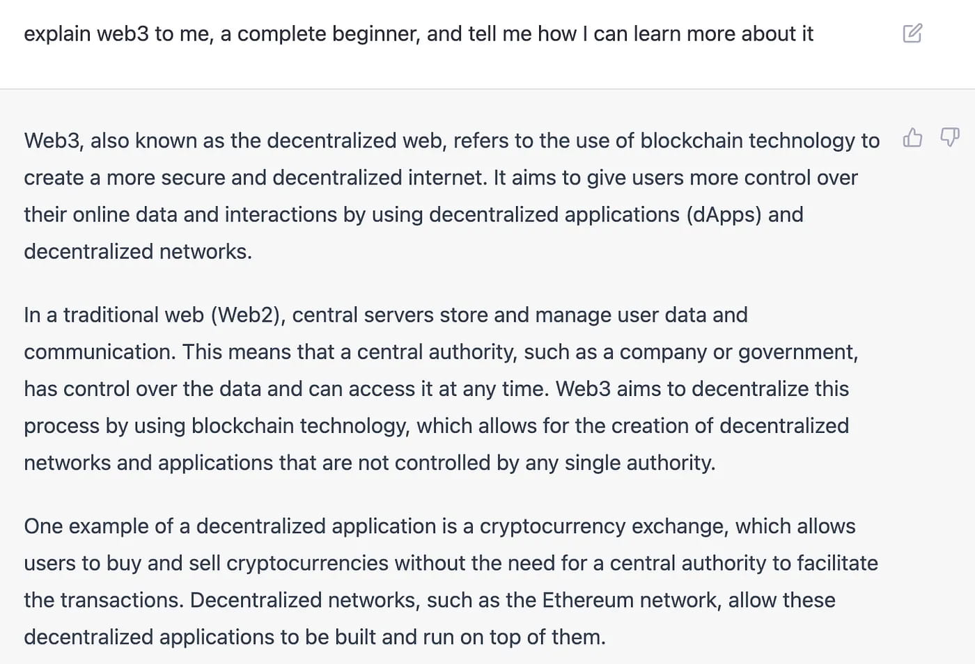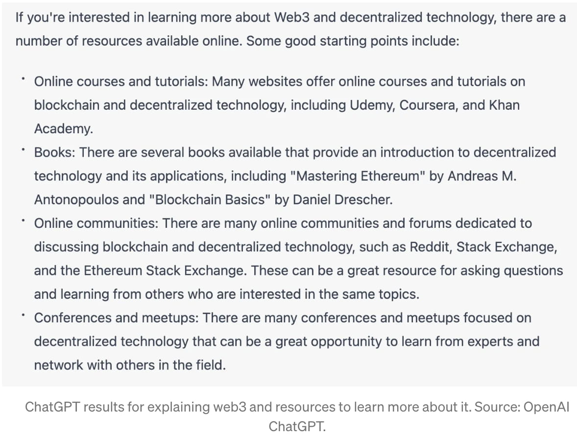 Naturalmente, l’istruzione va oltre i soli principianti assoluti; è uno strumento utile per chiunque voglia comprendere un nuovo angolo del Web3, che si tratti di zk-SNARK o di protocolli di comunicazione inter-blockchain. Poiché il Web3 è un settore diversificato e tecnicamente impegnativo, ci sono sempre nuove sfaccettature, idee e concetti con cui immergerti. Ed è per questo che in Web3 è assolutamente necessario uno strumento educativo sofisticato, come ChatGPT.