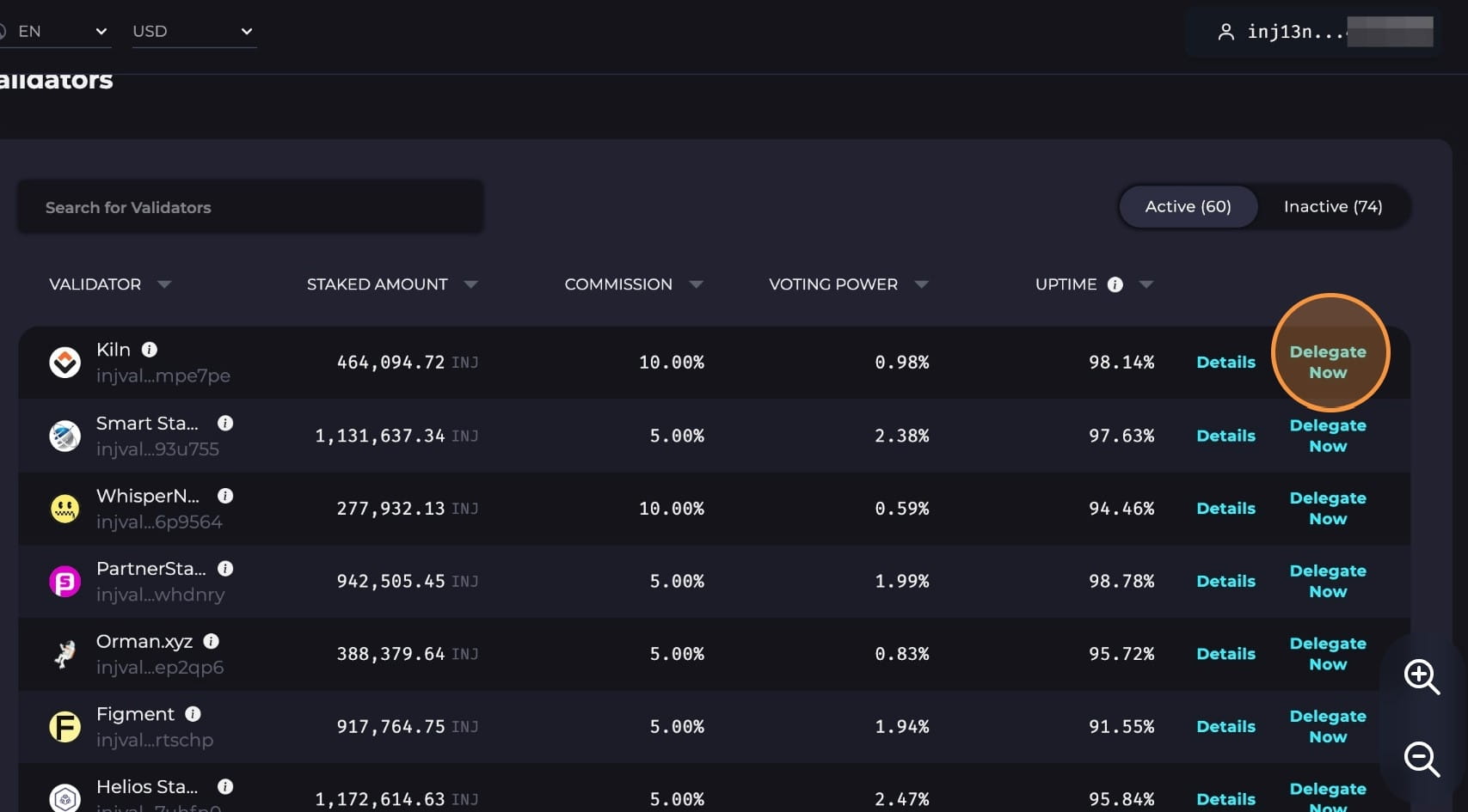 Scegli tra uno qualsiasi dei validatori disponibili e fai clic su "Delega ora"
