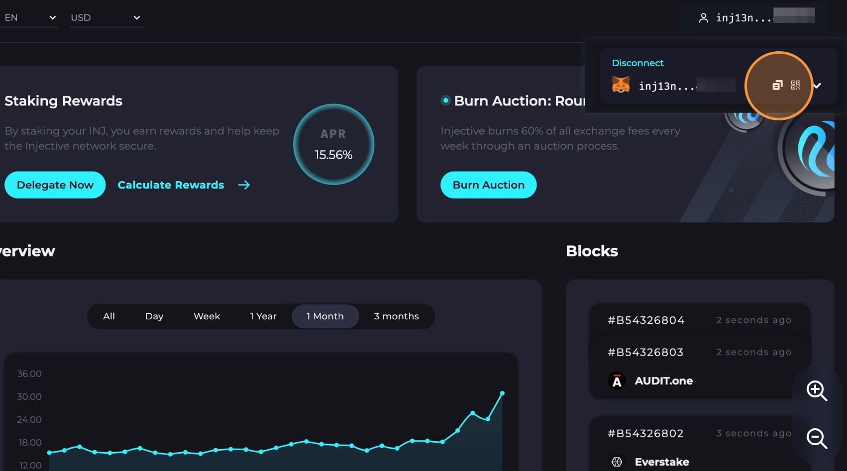 Seleziona il menu a discesa accanto all'indirizzo del tuo portafoglio Injective e fai clic su questa icona per copiare l'indirizzo del tuo portafoglio Injective.