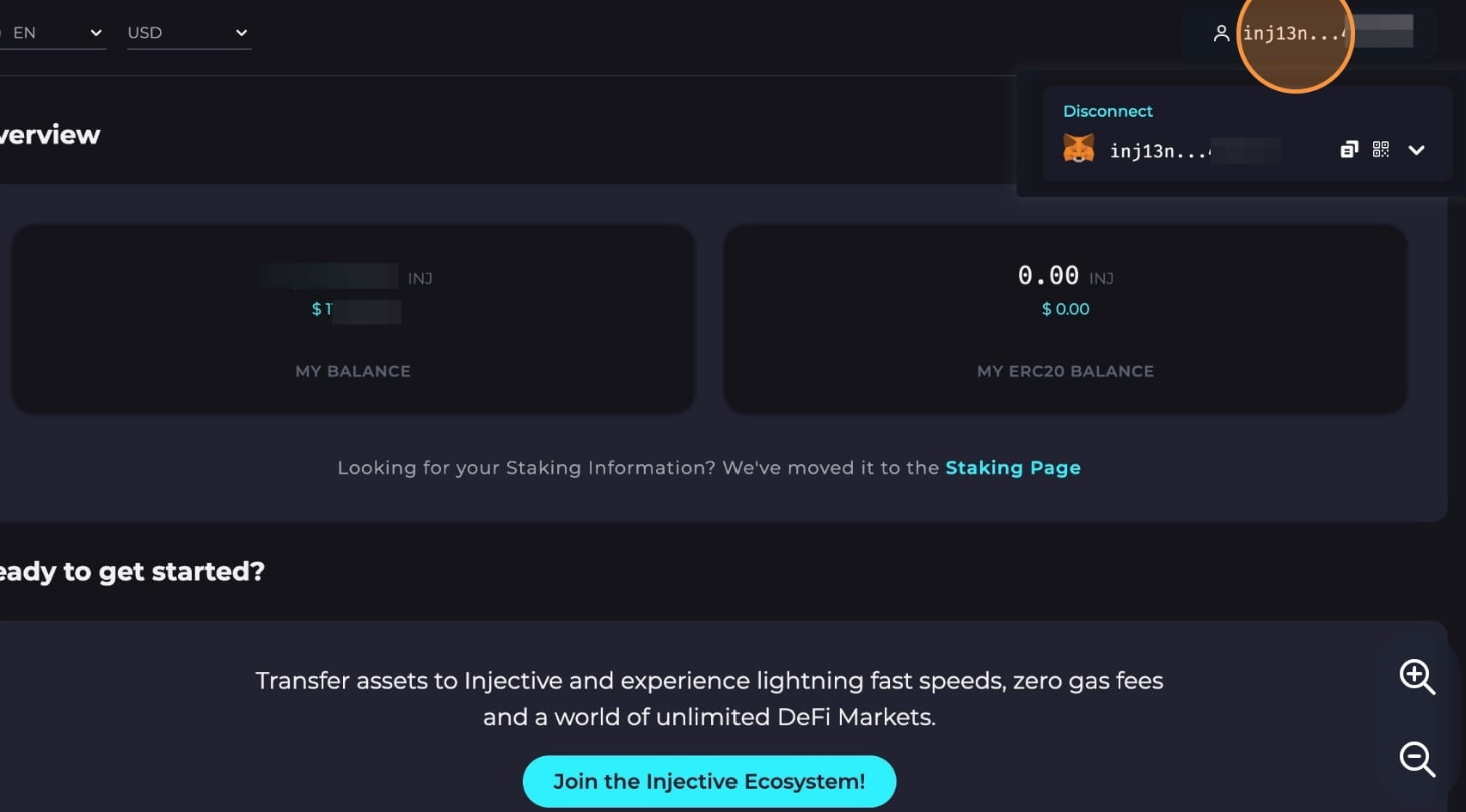 Una volta connesso, passa con il mouse sopra l'indirizzo del tuo portafoglio Injective