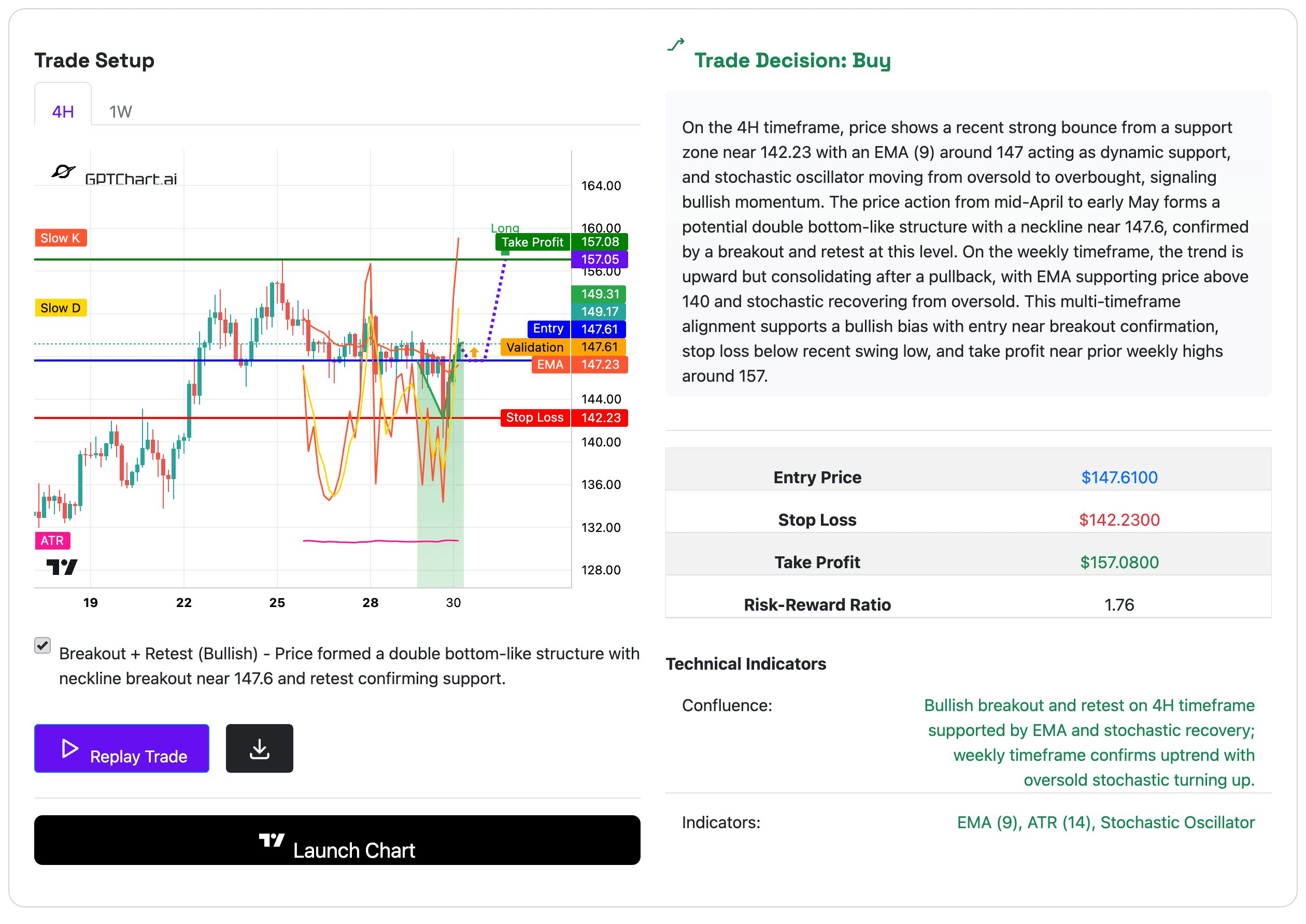 Decisione di Trading: COMPRA Sul timeframe 4H, il prezzo mostra un recente forte rimbalzo da una zona di supporto vicino a 142.23 con un EMA (9) intorno a 147 che funge da supporto dinamico, e l'oscillatore stocastico che si muove da ipervenduto a ipercomprato, segnalando un momento rialzista. L'azione del prezzo da metà aprile a inizio maggio forma una potenziale struttura a doppio fondo con una linea di collo vicino a 147.6, confermata da un breakout e un ritest a questo livello. Sul timeframe settimanale, la tendenza è al rialzo ma si sta consolidando dopo un ritracciamento, con l'EMA che supporta il prezzo sopra 140 e lo stocastico che recupera da ipervenduto. Questa allineamento multi-timeframe supporta un bias rialzista con ingresso vicino alla conferma del breakout, stop loss sotto il recente minimo swing, e take profit vicino ai massimi settimanali precedenti intorno a 157.