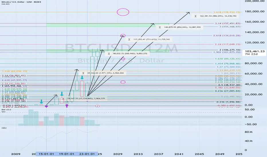 Basato sul grafico 12M BTCUSDT e le estensioni di Fibonacci, questi sono i principali obiettivi al rialzo e le potenziali zone di resistenza: