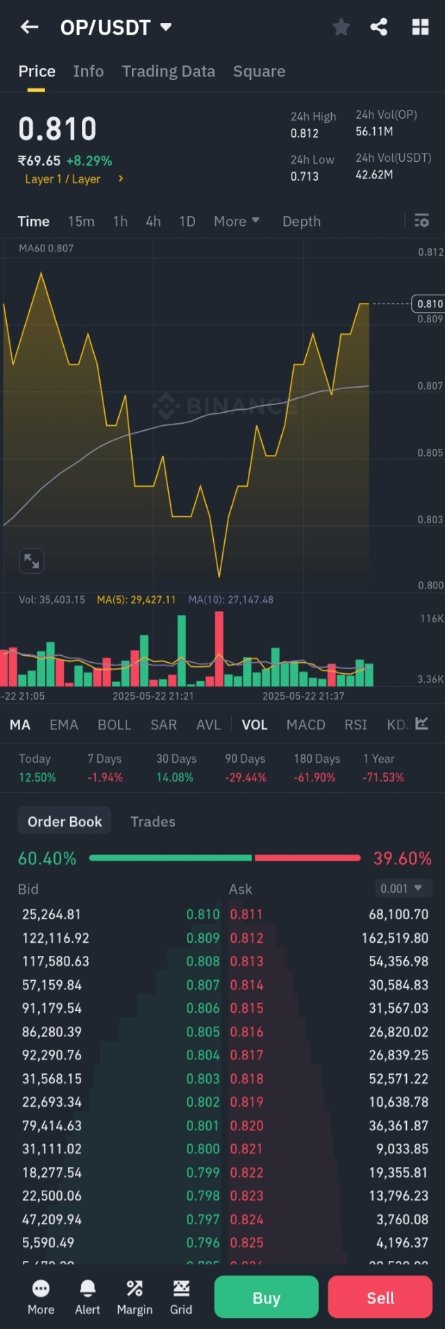A partire dal 23 maggio 2025, Optimism ($OP ) sta scambiando a circa $0.81 USDT, riflettendo un aumento dell'8% nelle ultime 24 ore.