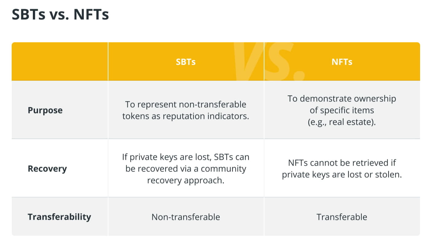 Una delle principali differenze tra SBT e NFT è il loro scopo. Gli SBT sono progettati per raccogliere capitale per un progetto o un'azienda, mentre gli NFT sono utilizzati per rappresentare un elemento o un contenuto unico. Gli SBT sono regolamentati dalle leggi sui titoli e devono rispettare i requisiti normativi, mentre gli NFT non sono soggetti alla stessa supervisione normativa.