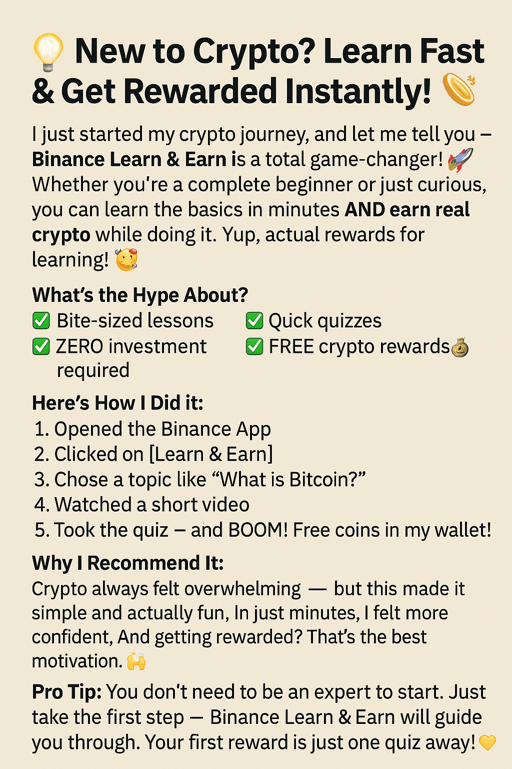 Ho appena iniziato il mio viaggio nella crypto, e lascia che ti dica, Binance Impara e Guadagna è un vero cambiamento di gioco! 🚀 Che tu sia un principiante assoluto o semplicemente curioso, puoi imparare le basi in pochi minuti E guadagnare crypto reale mentre lo fai. Sì, ricompense reali per l'apprendimento! 🥳🔥
