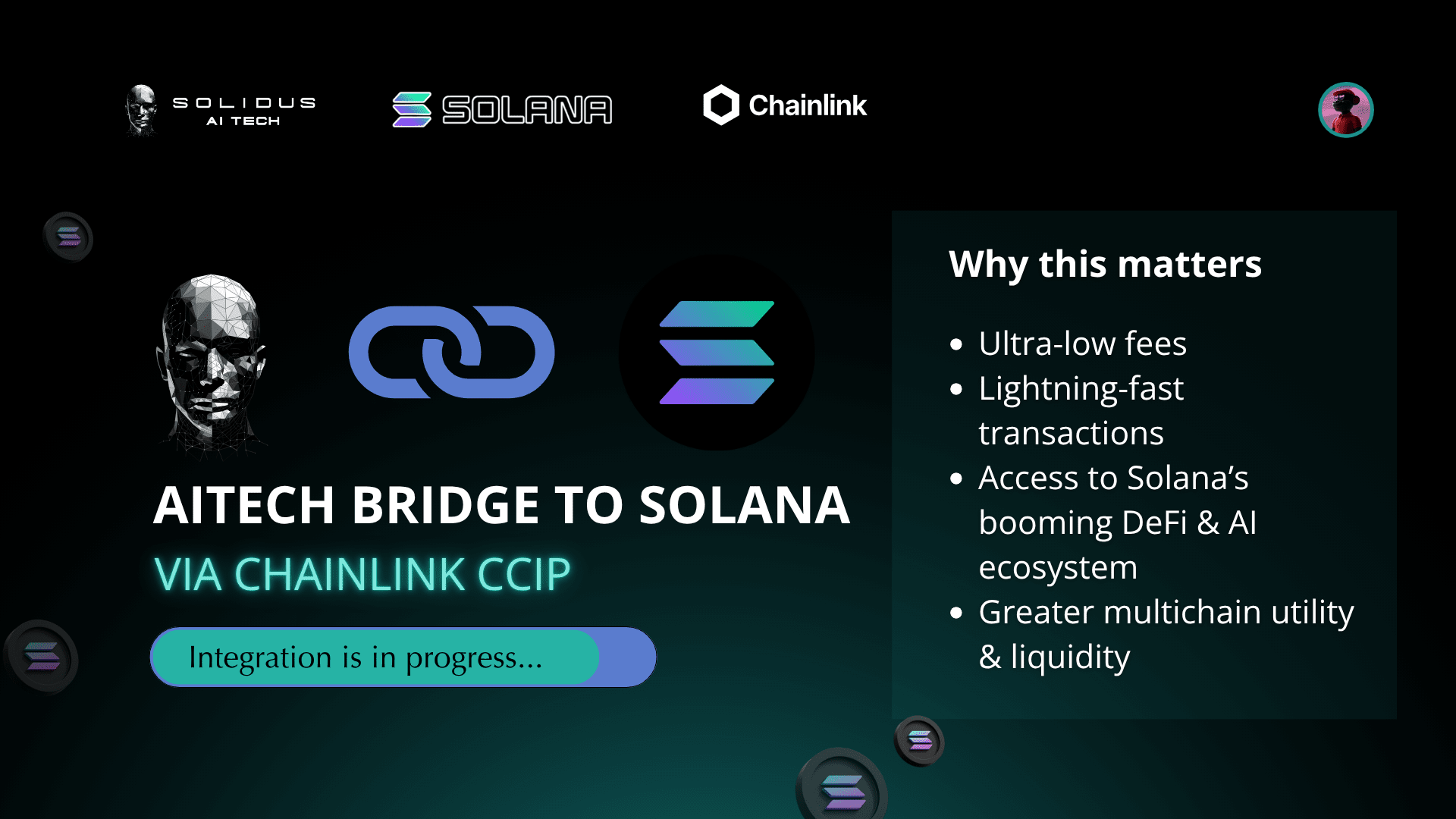 #Solidus AI Tech sta facendo un grande passo avanti con la sua prossima integrazione nell'ecosistema Solana — alimentata da Chainlink CCIP. Non si tratta solo di transazioni più veloci e più economiche. È una mossa audace nella roadmap cross-chain di Solidus progettata per rendere $AITECH più accessibile, scalabile e prezioso nel panorama Web3.