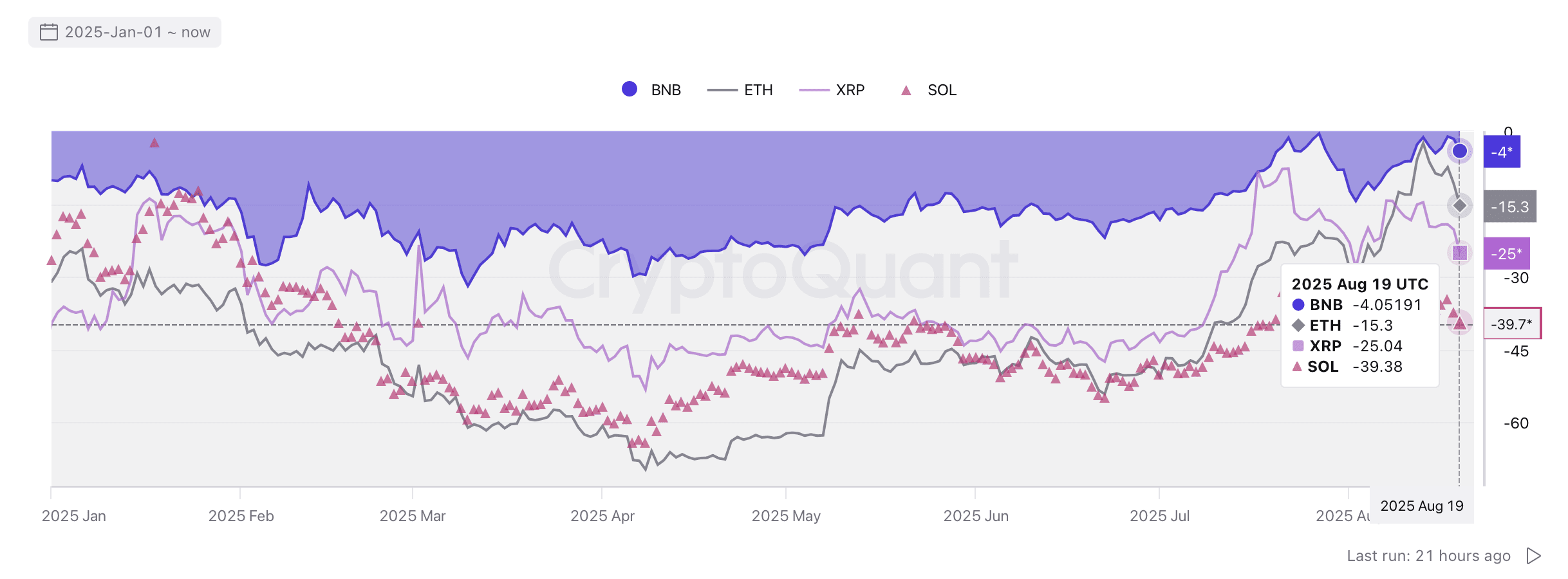 BNB, come uno dei primi altcoin, è tornato a nuovi ATH, superando tra gli altri XRP, SOL e TRX – altri progetti stanno ancora consolidando o non hanno recuperato il valore del 2021. A differenza di ETH, ADA o DOGE, che non sono ancora tornati ai loro picchi, BNB conferma di essere l'altcoin di prima scelta nel ciclo attuale.