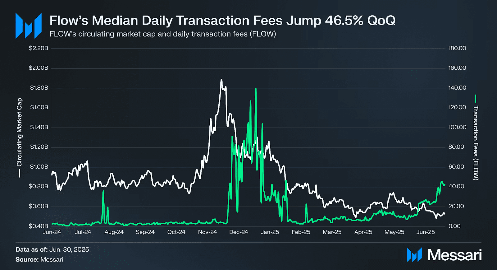 Ecco dove emerge l'anomalia. La linea verde nel grafico mostra le spese di transazione giornaliere della rete FLOW. Queste spese sono un riflesso di quanto attivamente gli utenti stiano transazionando e utilizzando la rete. Sfortunatamente, anche se la capitalizzazione di mercato è aumentata, le spese di transazione di FLOW hanno subito una drastica diminuzione, addirittura crollando del 46,5% su base trimestrale (QoQ)! 😨