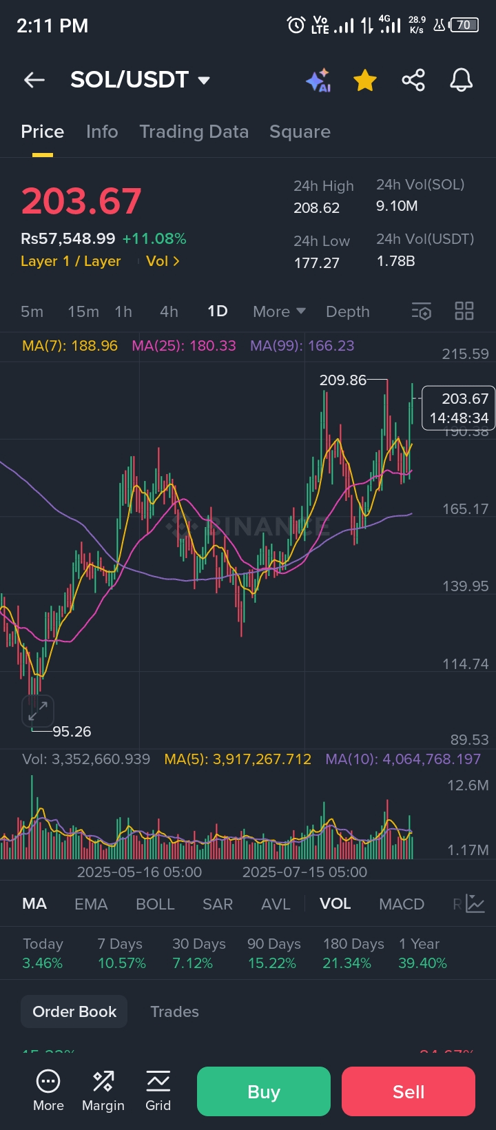La coppia SOL/USDT mostra un forte slancio rialzista, scambiando a **203.67 USDT**, in aumento del **+11.08%** nell'ultima 24 ore. Con un massimo di 24 ore di **208.62** e un volume solido a supporto del movimento, SOL continua a sovraperformare nel segmento Layer 1. Ecco un'analisi dettagliata per il tuo prossimo trade: