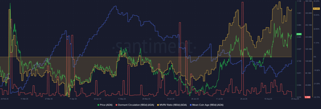 La struttura rialzista di Cardano e la sfida della resistenza a 1 dollaro significano che un gran numero di detentori potrebbe realizzare profitti💰. L'indicatore MVRV a 180 giorni mostra che i detentori hanno effettivamente pressione a vendere, ma finora questa minaccia non si è concretizzata.