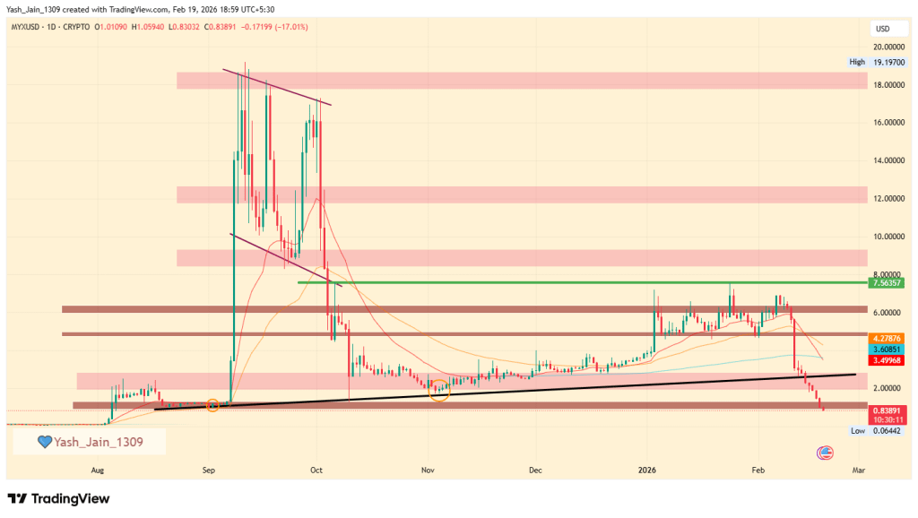 Ciò che è stato testimoniato nel prezzo di MYX non è solo un calo. È collassato gravemente. Da un picco all'inizio di febbraio di $6.94, il token ha perso oltre l'80%, persino tagliando una linea di tendenza ascendente a lungo termine che era rimasta intatta per mesi. Questa violazione è stata la più inaspettata, ma è comunque avvenuta e ha persino perso il livello di supporto cruciale di $1 da settembre 2024. Ora, MYX/USD scambia a $0.8762, riducendo la sua capitalizzazione di mercato a soli $221.75 milioni, ma le domande su questo calo stanno aumentando: È finita per MYX, o è stata una mossa strategica di un grande giocatore?