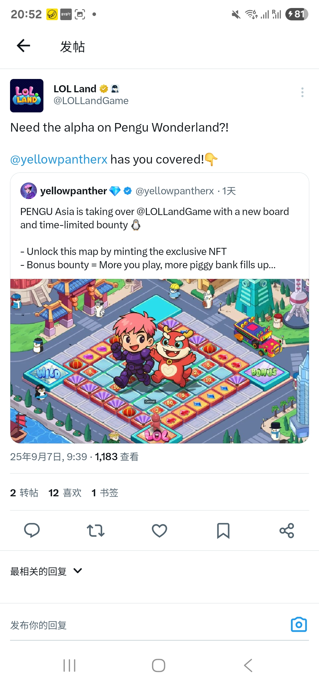 Tuttavia, un KOL ha detto che la comunità Pudgy Penguins Asia-Pacifico ha già incorporato il gioco LOL Land, e il tweet di questo KOL è stato retwittato dall'account ufficiale di LOL Land, il che è considerato un'approvazione.